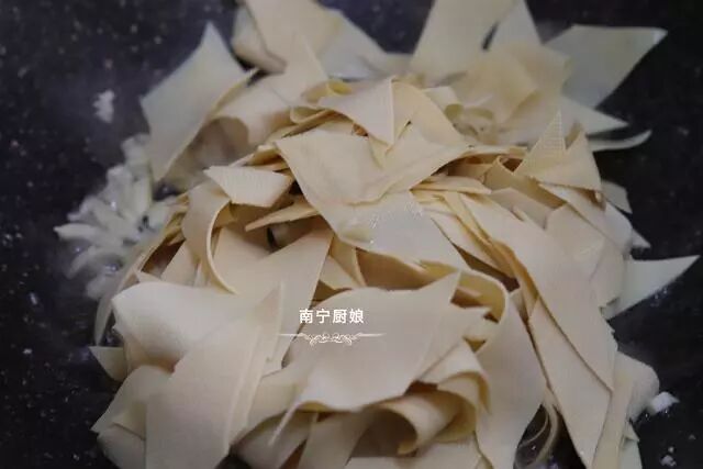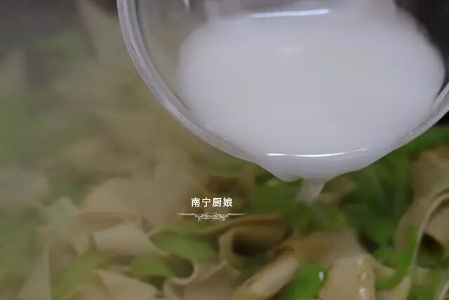 4. 翻炒几下后调制水淀粉浇在千张上,等汤汁变得黏稠的时候可以出盘。