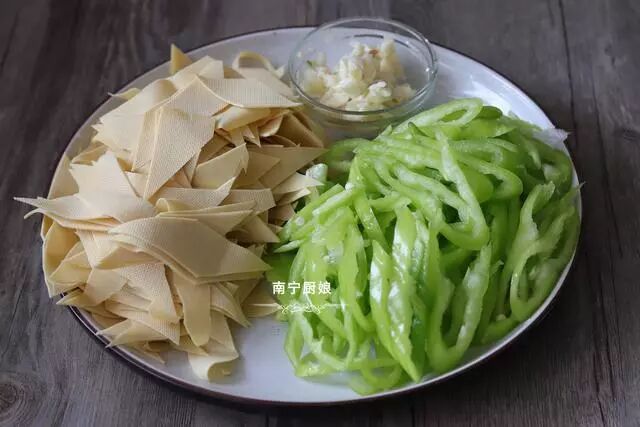 1. 把千张切成菱形的片状,看起来会非常美观,这就是考验刀工的时候了。青椒简单切成小细丝就可以,大蒜捣成泥状。