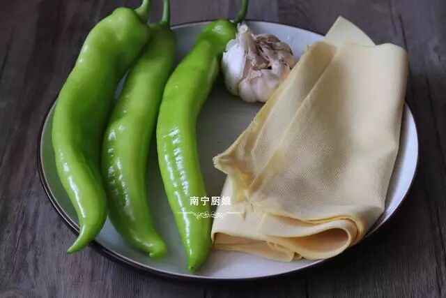准备好青椒,几张千张和大蒜,淀粉,食盐,油。挑选青椒的时候准备新鲜的,如果是稍稍多带一些辣味的也可以,千张购买的时候要检查一下是否有异味,有味道就证明时间太长了,最好不要购买了。