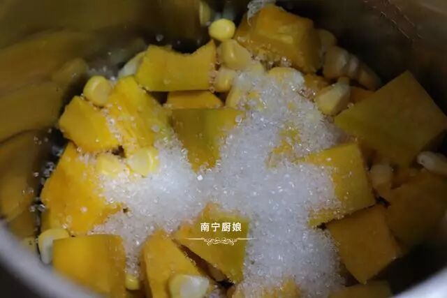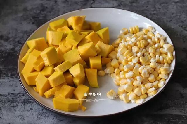 准备黄皮南瓜,去皮切成小块,把玉米粒弄好,白砂糖备用。