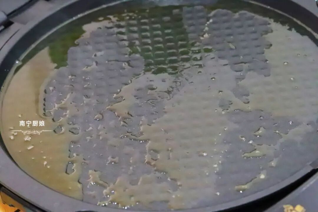 4、紫薯泥搅拌好之后,就可以开启电饼铛预热了,因为预热也需要至少5分钟,预热好之后刷上一层油,调小火。