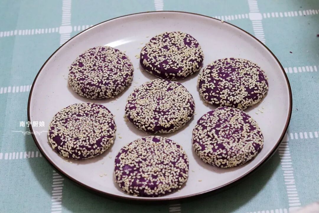 5、把紫薯泥分成均等的小面团,然后按压成小圆饼状,再在双面撒上白芝麻,按压平整。
