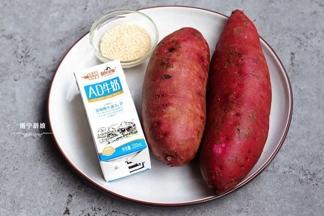 准备好食材:紫薯2个、牛奶1瓶、白芝麻10克、白糖1勺、糯米粉50克。