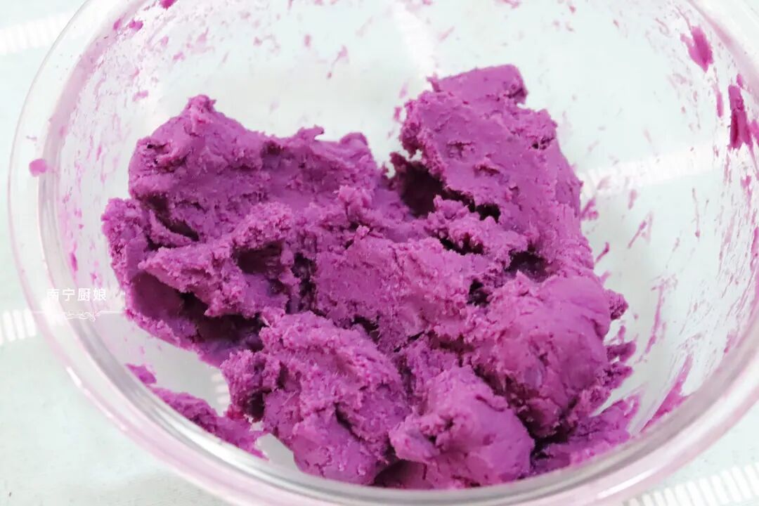 2、把蒸熟的的紫薯在碗中捣成泥。