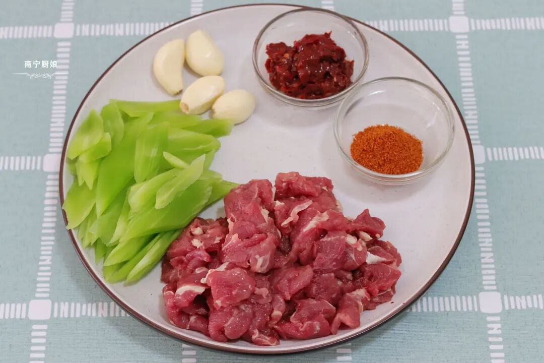 准备好食材:牛里脊肉300克切片、莴笋1根去皮切片、郫县豆瓣酱1勺、辣椒粉1小勺、花椒粉1克、大蒜4粒切碎、香葱1根切碎、玉米淀粉30克、小苏打1克、食盐1勺。