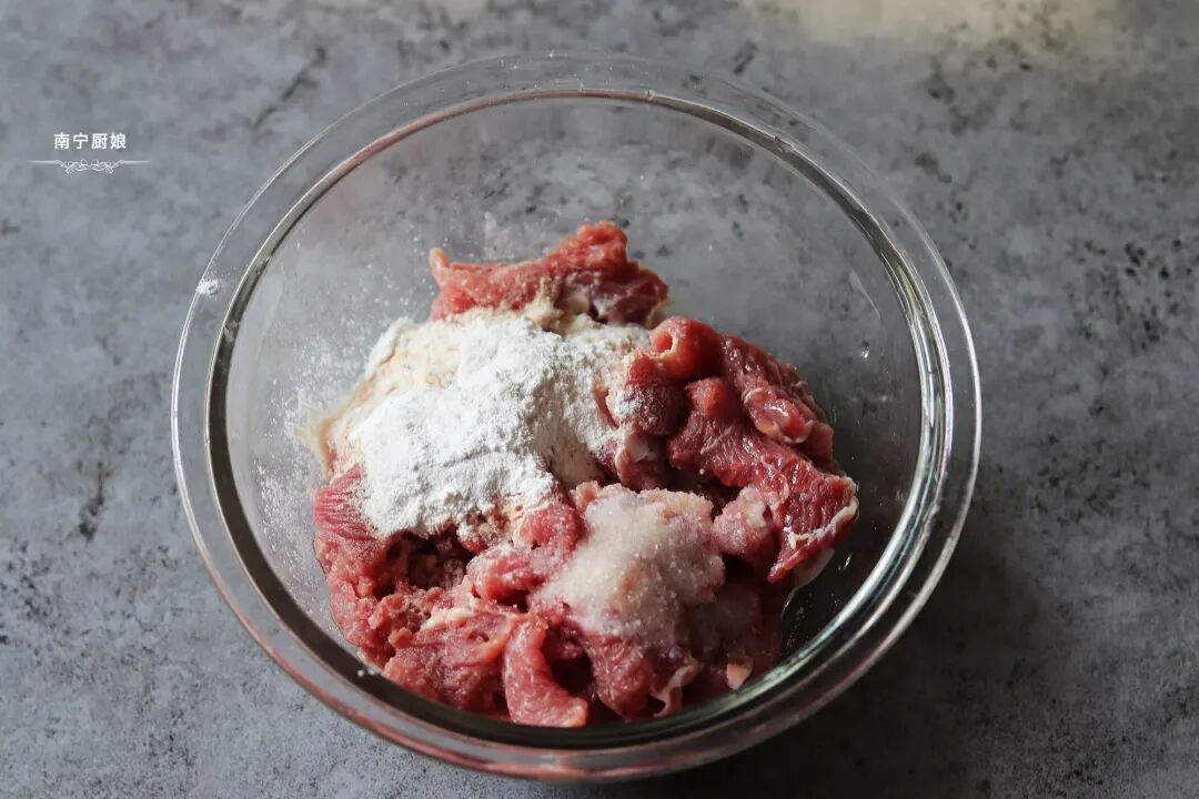 1、牛肉最好选购里脊肉,然后在切得薄一点,再放入苏打粉和玉米淀粉腌制过后,鲜嫩又爽滑,非常可口。