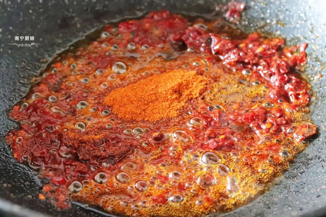 2、在锅里倒入适量的油小火烧热,放入郫县豆瓣酱炒出红油,再倒入辣椒粉一起翻炒均匀。