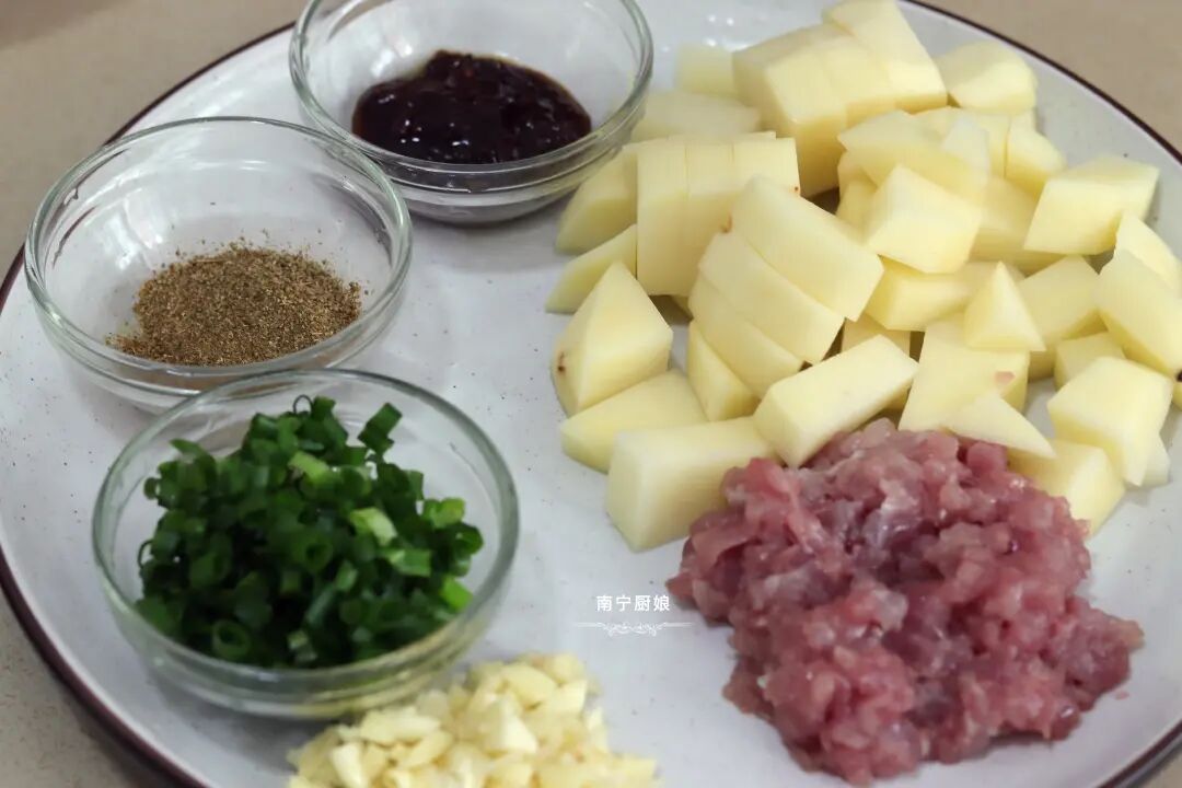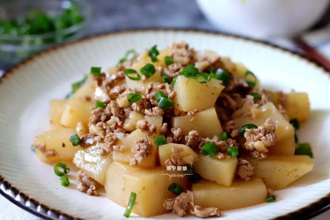土豆可以说是一种超人气的食材,本身没有异味,而且烹调方式也是多种多样,即可凉拌、又可炒着吃、烤着吃、炖着吃、烫着吃等。土豆是粮食作物中维生素含量最全面的,同等份量食材中,土豆的维生素含量是胡萝卜的2倍、苹果的4倍之多。所以建议大家日常可以多吃土豆,那么今天厨娘和大家分享一道土豆炖着吃的做法——孜然肉末炖土豆。这道菜做法简单又营养美味,很适合上班族朋友在家做来吃哦!