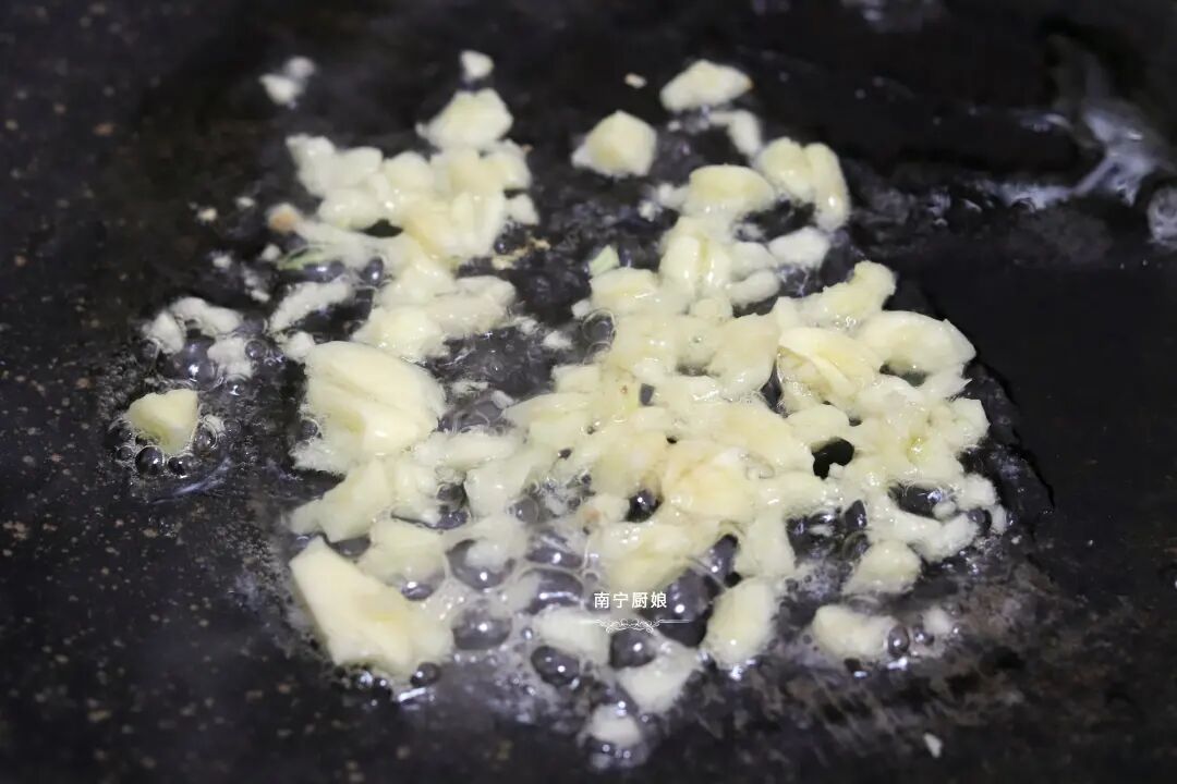 第二步:起锅,倒入适量的油小火烧热,把蒜米倒进去爆香。