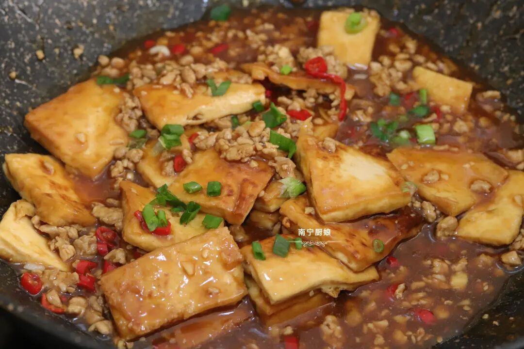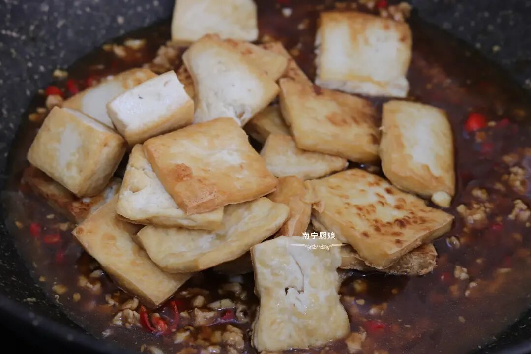 第六步:继续开大火,让酱汁充分的和豆腐块融合,豆腐块也在酱汁的沸腾中把酱汁的味道吸入进去,待汤汁变少时,即可关火出锅。