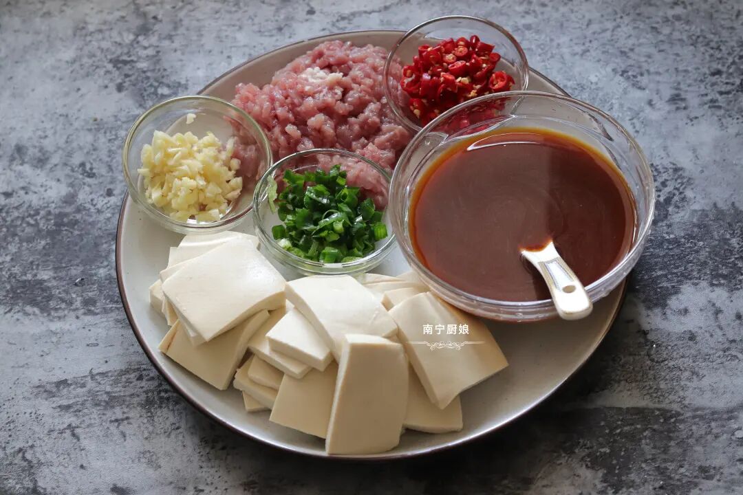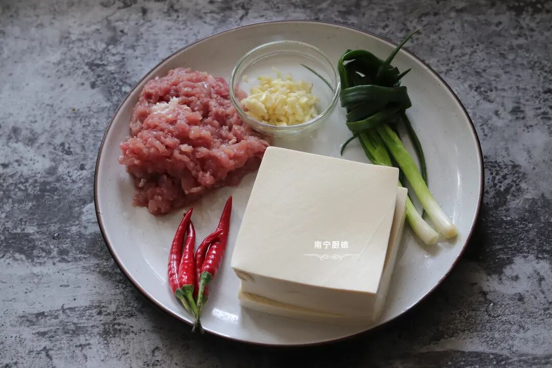 准备好食材:北豆腐4块、猪肉末150克、小红椒4颗、葱花1根、生姜1块、蒜米4粒、白糖半勺、生抽一勺、香醋半勺、淀粉小半勺、食盐小半勺。