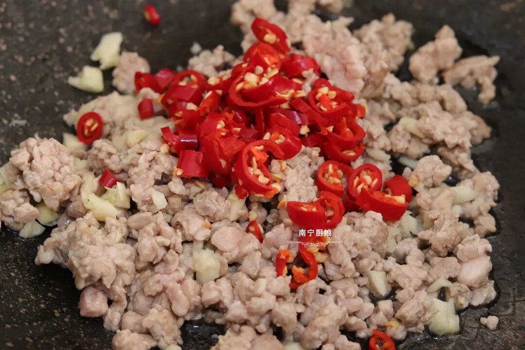 第三步:之前煎制豆腐的底油可以继续加热,把肉末倒进去炒香,然后倒入姜蒜末和小红椒碎。