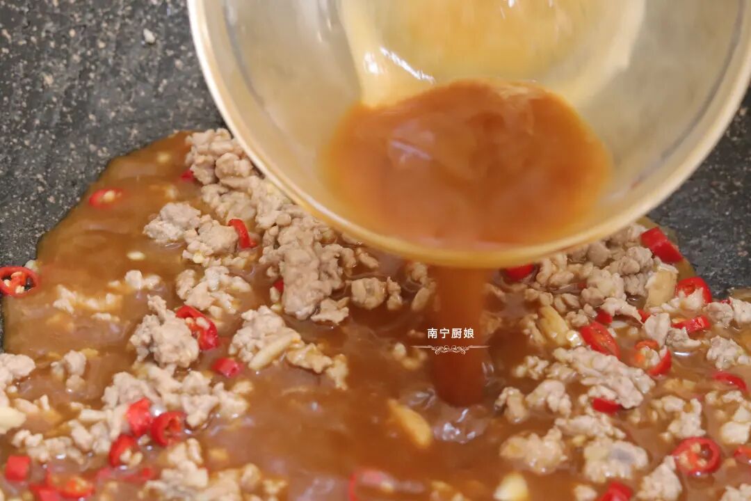 第四步:再倒入之前调制好的酱汁,开大火烧至粘稠。