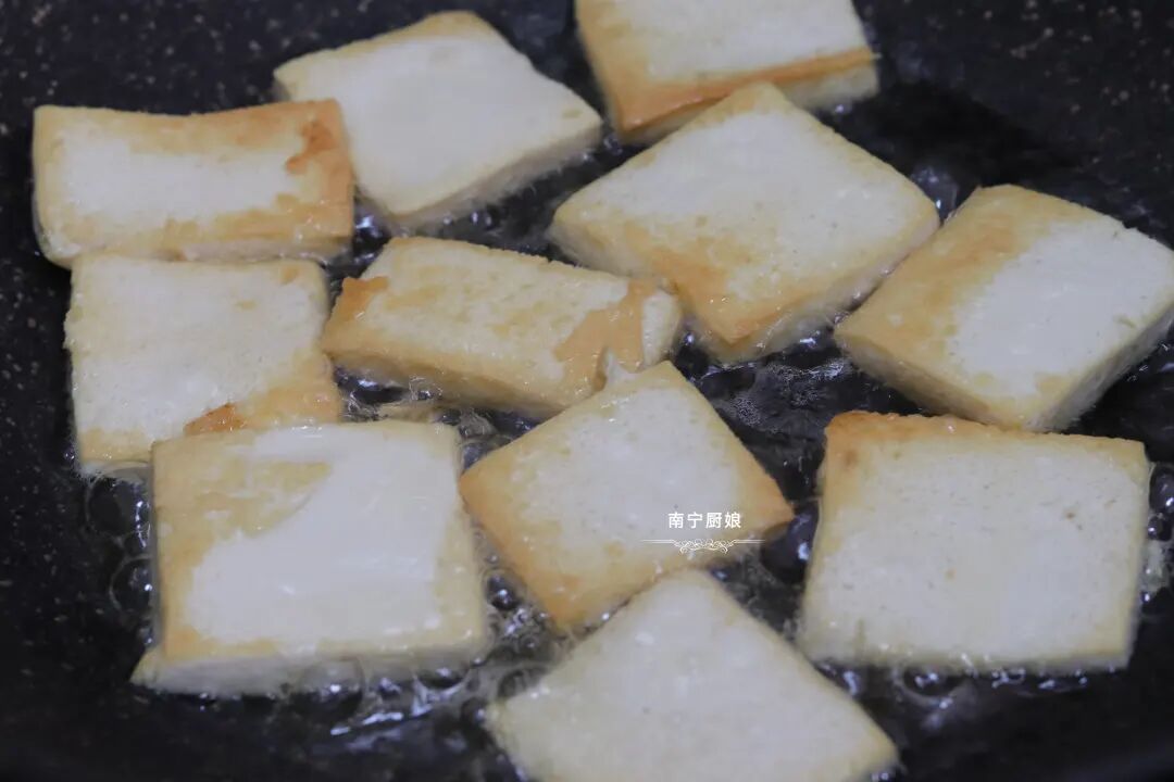 第二步:起锅,在锅里倒入适量的油,小火烧热,把豆腐块铺在锅底小火煎至两面焦黄后盛出。