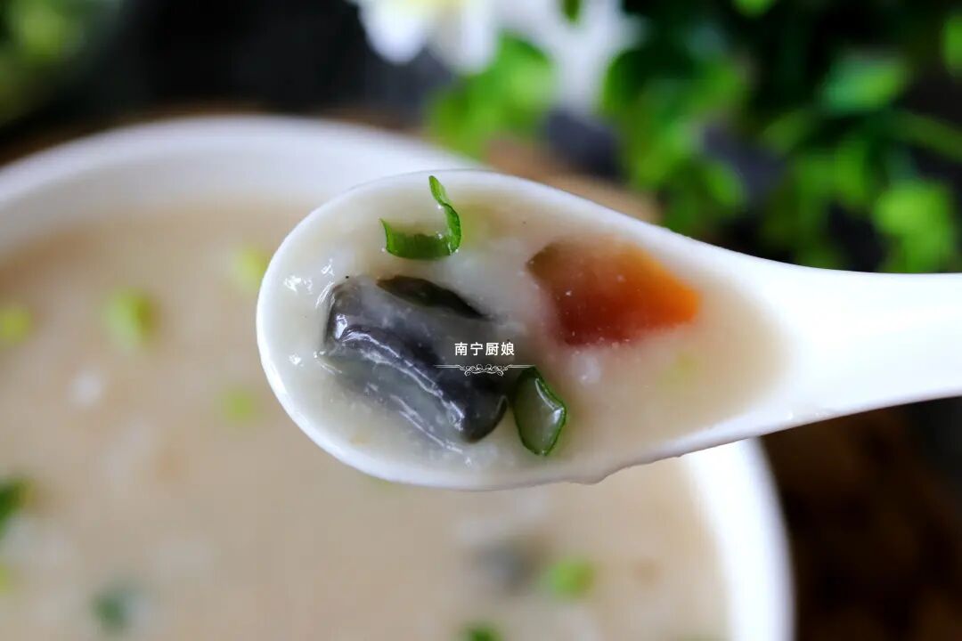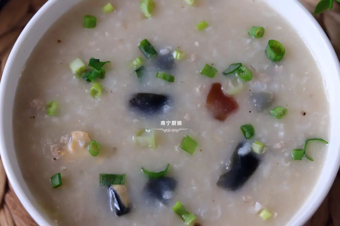 出锅装碗,再撒入些许葱花碎或者青菜碎点缀,一碗粘稠鲜香的皮蛋瘦肉粥就做好啦!