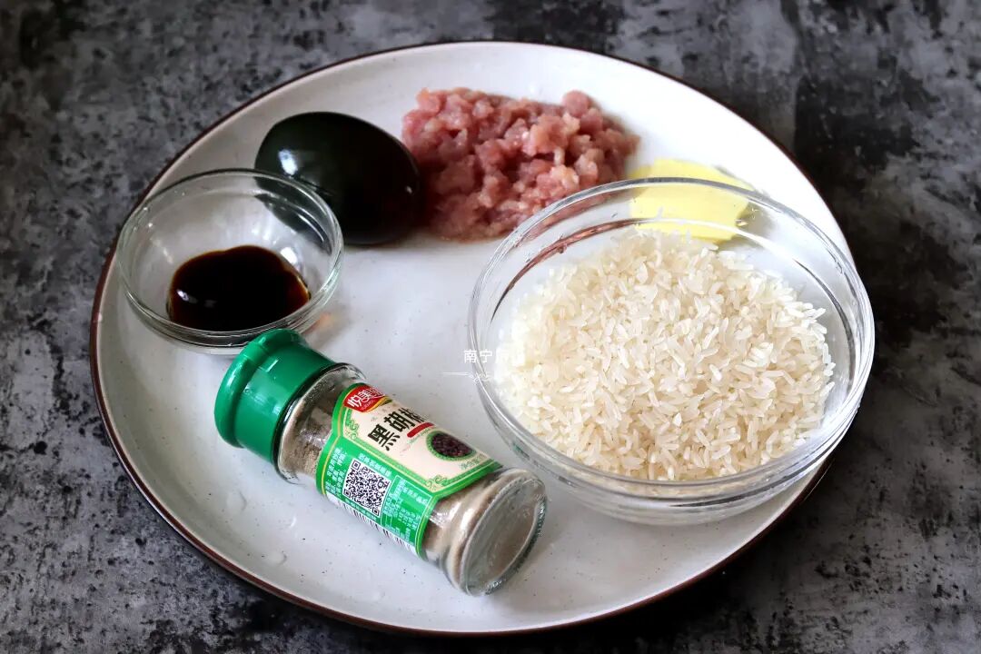 准备好食材:大米100克、皮蛋1颗、猪肉末150克、食用油2滴、生姜2片、食盐1勺、蚝油一勺、白胡椒粉半勺、葱花碎20克。