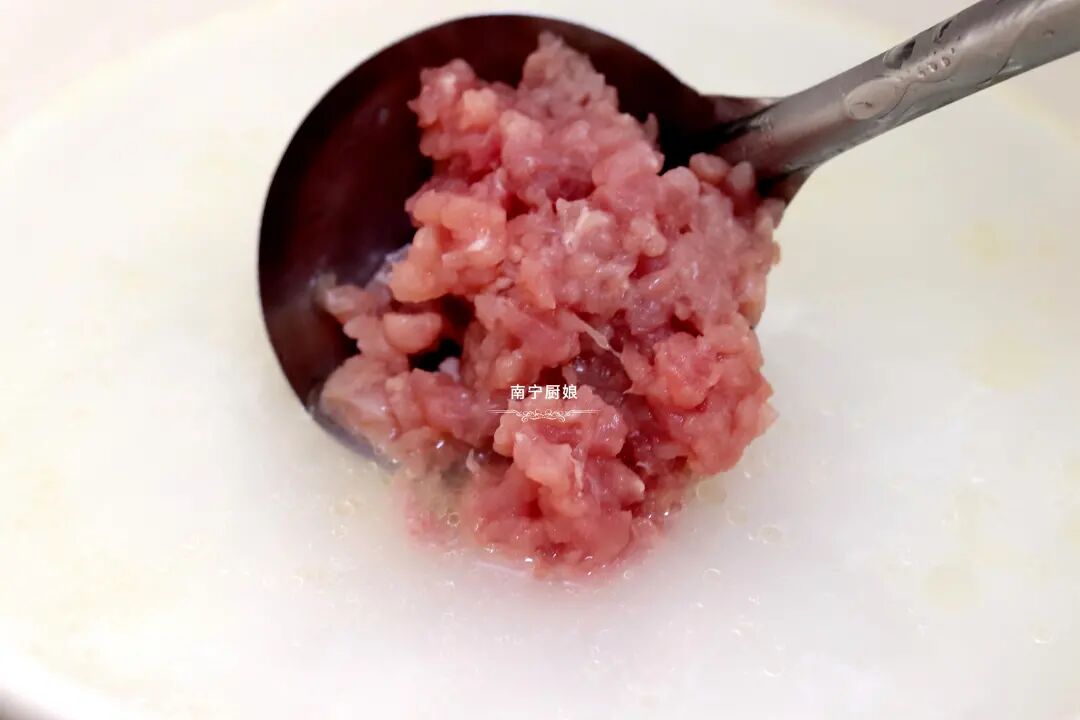 第三步:等把粥煮到粘稠的时候,放入皮蛋块、猪肉末、1勺食盐、半勺胡椒粉、1勺蚝油,搅拌均匀。