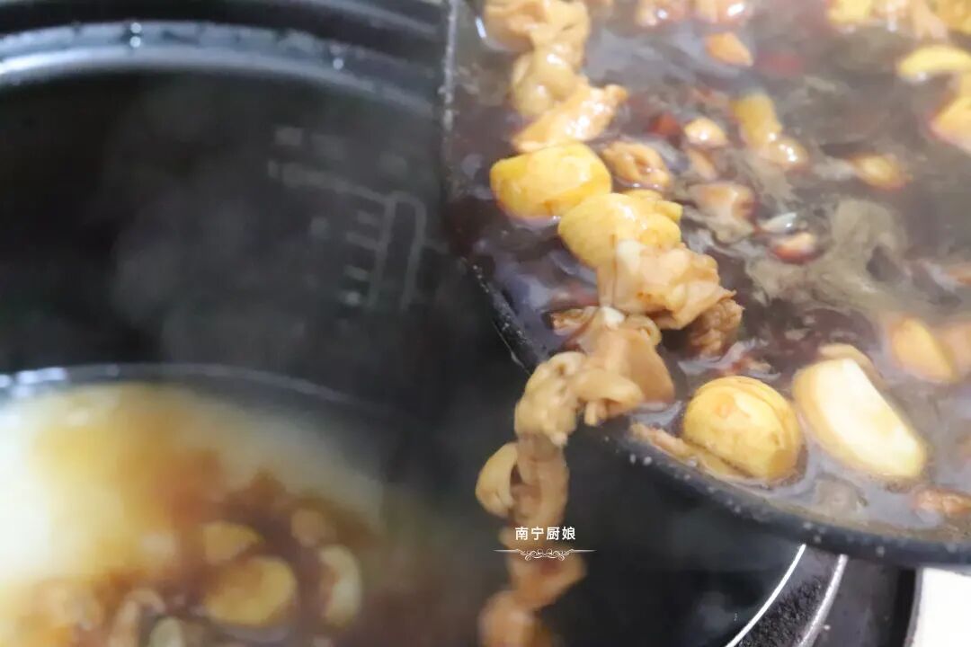6、把煮好的板栗鸡腿肉一起倒入装有大米的锅里(大米可以提前就淘洗好放进锅里),盖上锅盖,选择煮饭键煲煮20分钟即可。