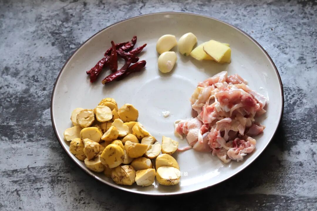 1、板栗如果能买到剥壳的就尽量买剥壳的吧,自己买回来煮了再剥壳挺费劲费时间的,蒜米去皮、生姜切片、鸡腿肉切块。