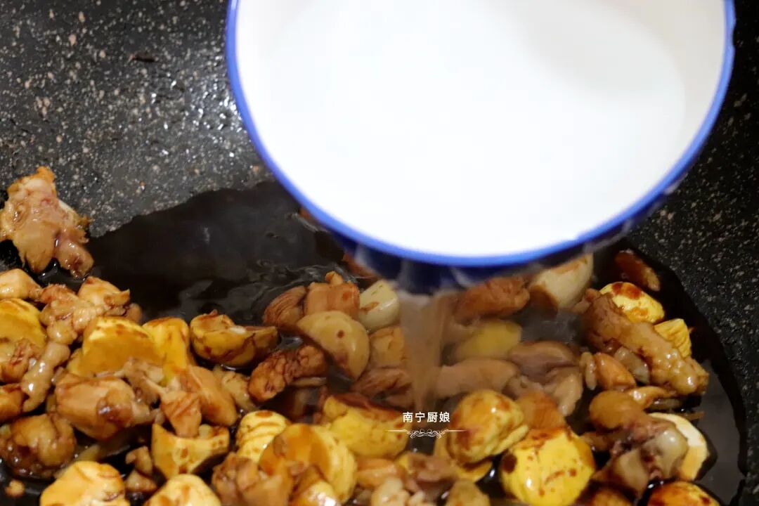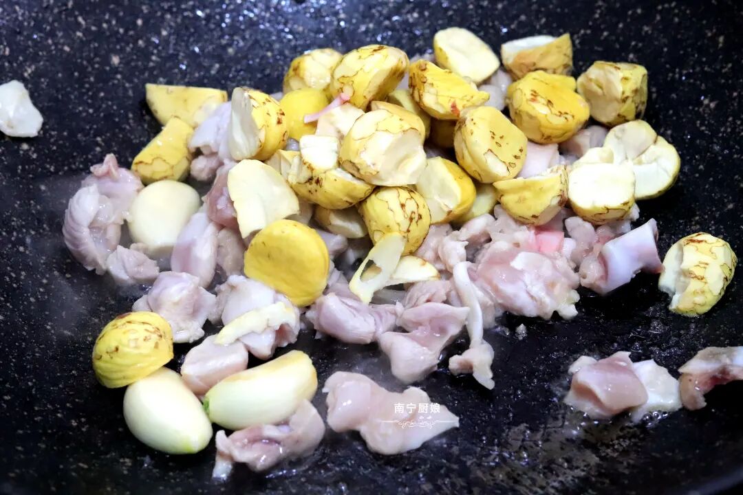 3、把鸡腿肉、板栗、蒜米倒进去一起翻炒。