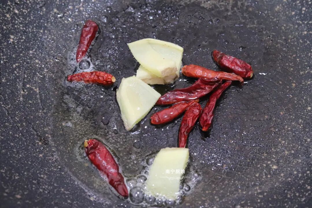 2、起锅,在锅里倒入适量的油,小火烧热,倒入干辣椒和生姜一起爆香后丢掉(要不然和米饭一起煲煮,会让米饭变苦的哦,所以一定要记得把干辣椒和生姜爆香后丢掉)。