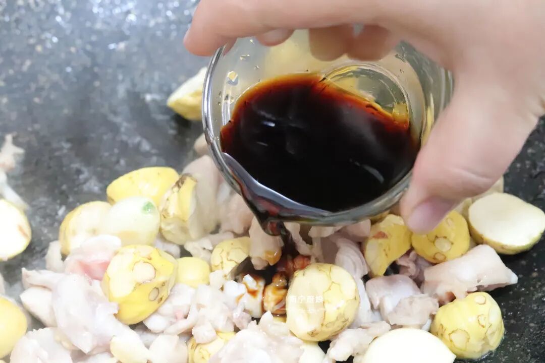 4、倒入1勺生抽、半勺老抽、10克冰糖。