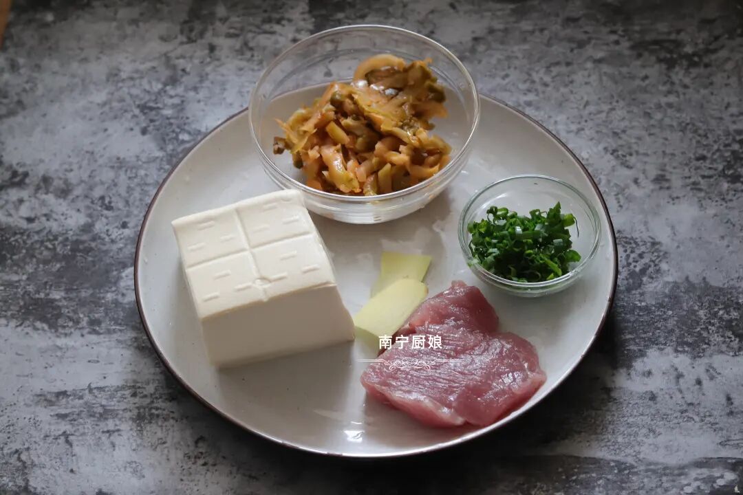 准备好食材:水豆腐一大块、猪瘦肉200克、榨菜100克、葱花1根、生姜1块、生抽2勺、食盐1勺。