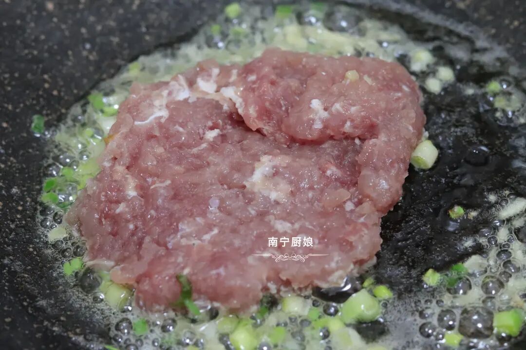 第四步:接着把猪肉末倒进去一起用锅铲划散开来,然后翻炒变色炒熟。