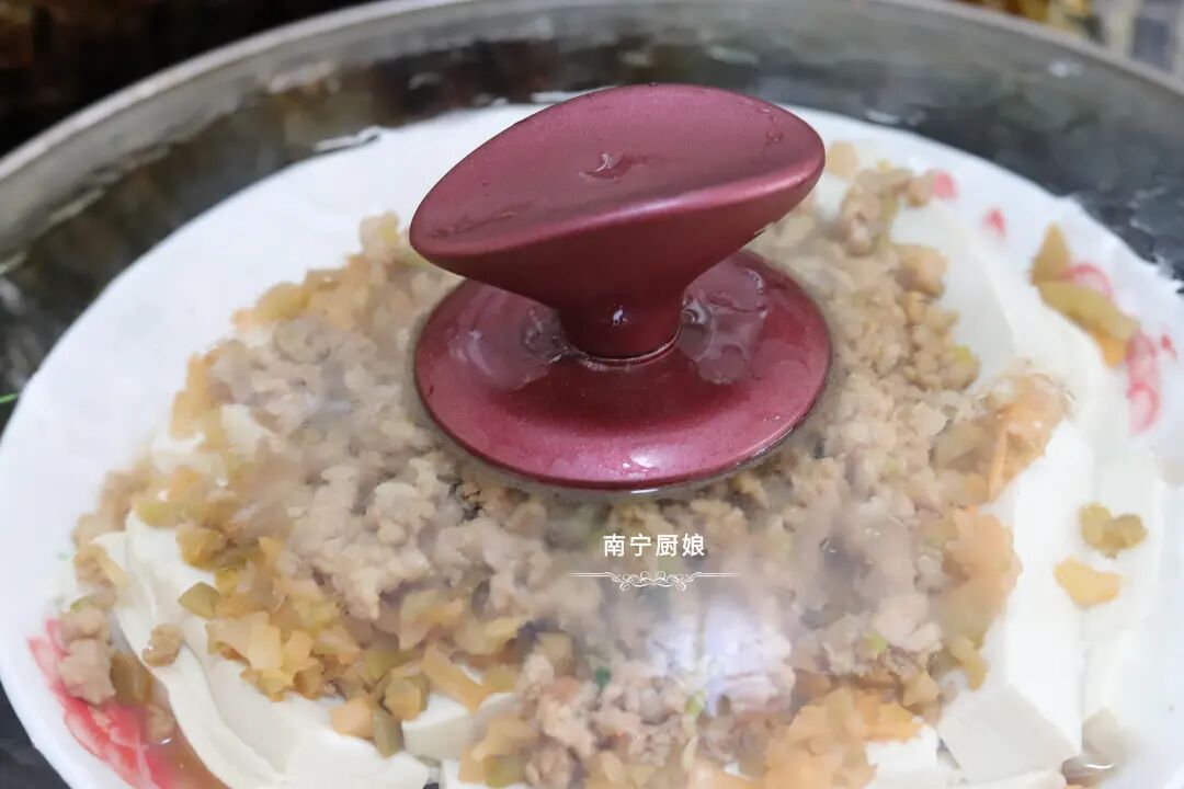 第六步:把炒好的肉末铺在豆腐上面,放入锅里,盖上锅盖隔水蒸上10分钟。