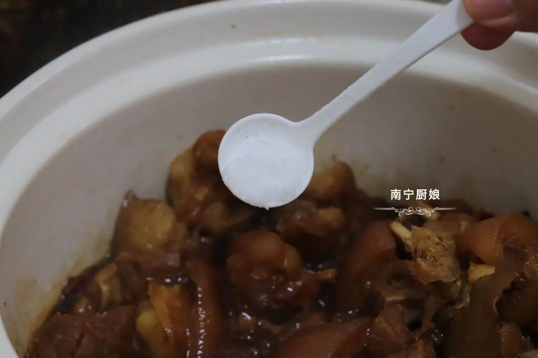 3,建议最后出锅之前再放盐,如果提前放盐,会让肉质变硬哦,如果汤汁不够,可以加入开水来补偿,不能加入凉水哦,会让肉质变腥,肉也不好吃。