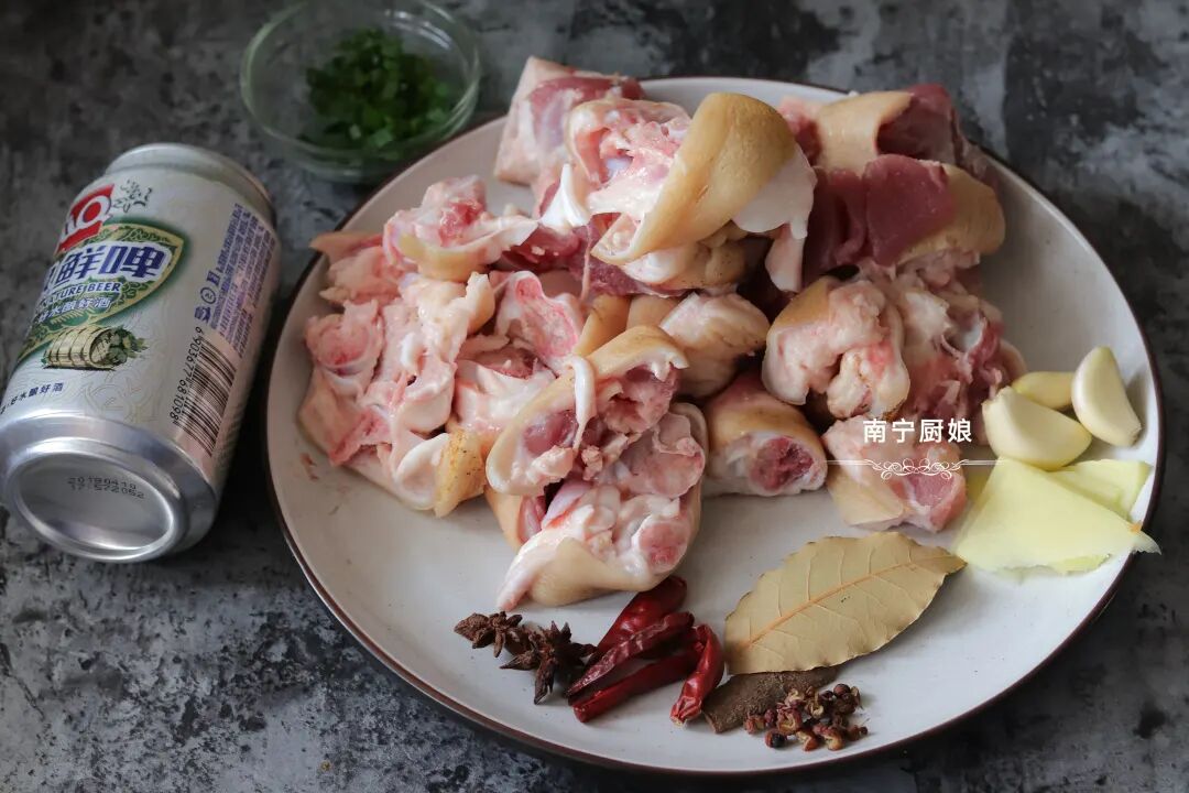 准备好食材:猪蹄半只(一只猪蹄的一半)、啤酒一罐、香叶2片、干辣椒4颗、蒜米3粒、八角2颗、桂皮1块、胡椒10粒、2勺生抽、1勺蚝油、10克冰糖。