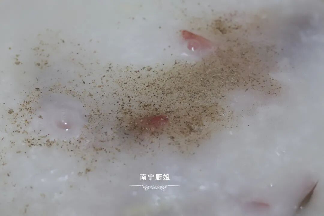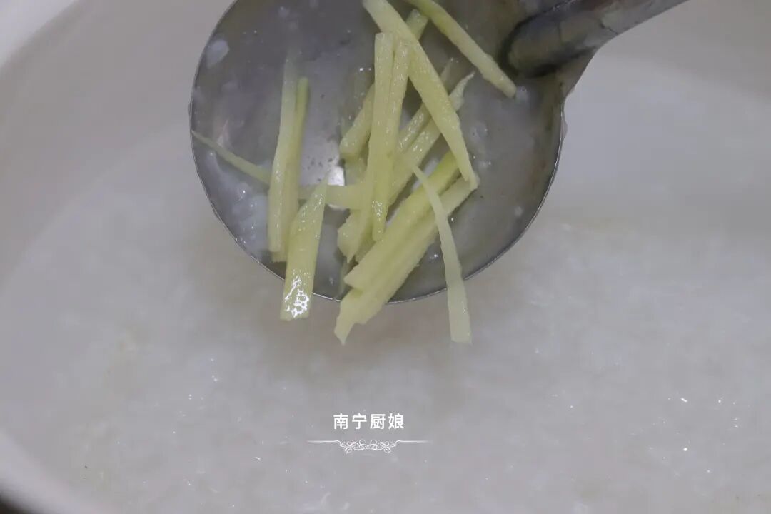 6、把生姜丝、虾身、胡椒粉倒进锅里和白粥一起搅拌均匀后盖上锅小火煲煮10分钟。