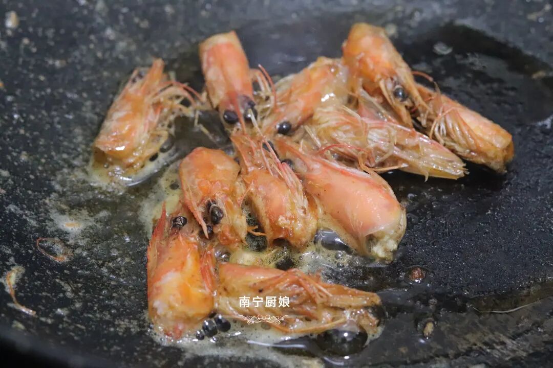 3、趁着腌制虾身的空闲,我们在锅里倒入少量的油,小火烧热,把虾头倒进去炸虾油,真的很香,然后装入碗里待用。