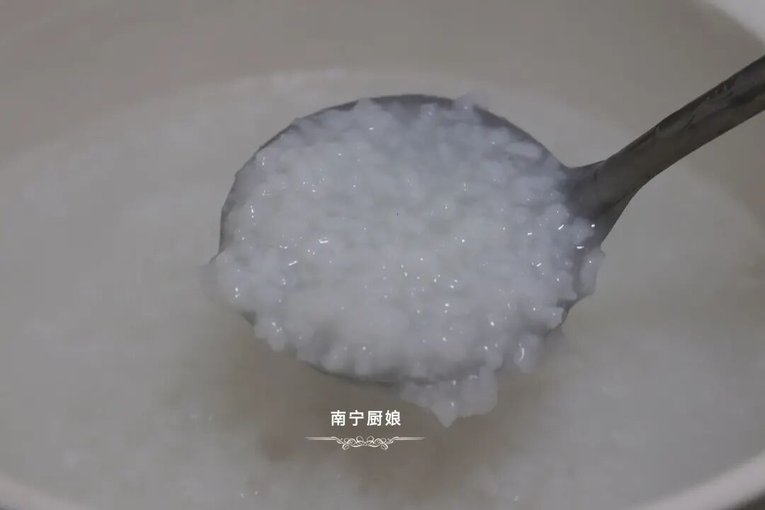 4、在砂锅里倒入淘洗好的大米煮至粘稠(大米可以提前一个晚上淘洗好放入保鲜袋后放入冰箱里冷冻一个晚上,这样煮出来的粥很粘稠爽滑)。