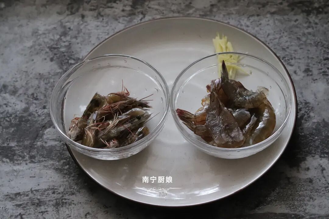1、把鲜虾去头开虾背去虾线,虾头不要丢掉,后面可以炸油用,生姜切丝,葱花切碎。