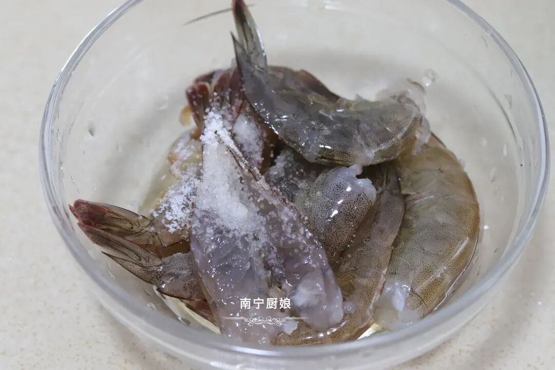 2、把虾身放入一个碗里,然后放入一勺食盐和一勺料酒腌制10分钟。