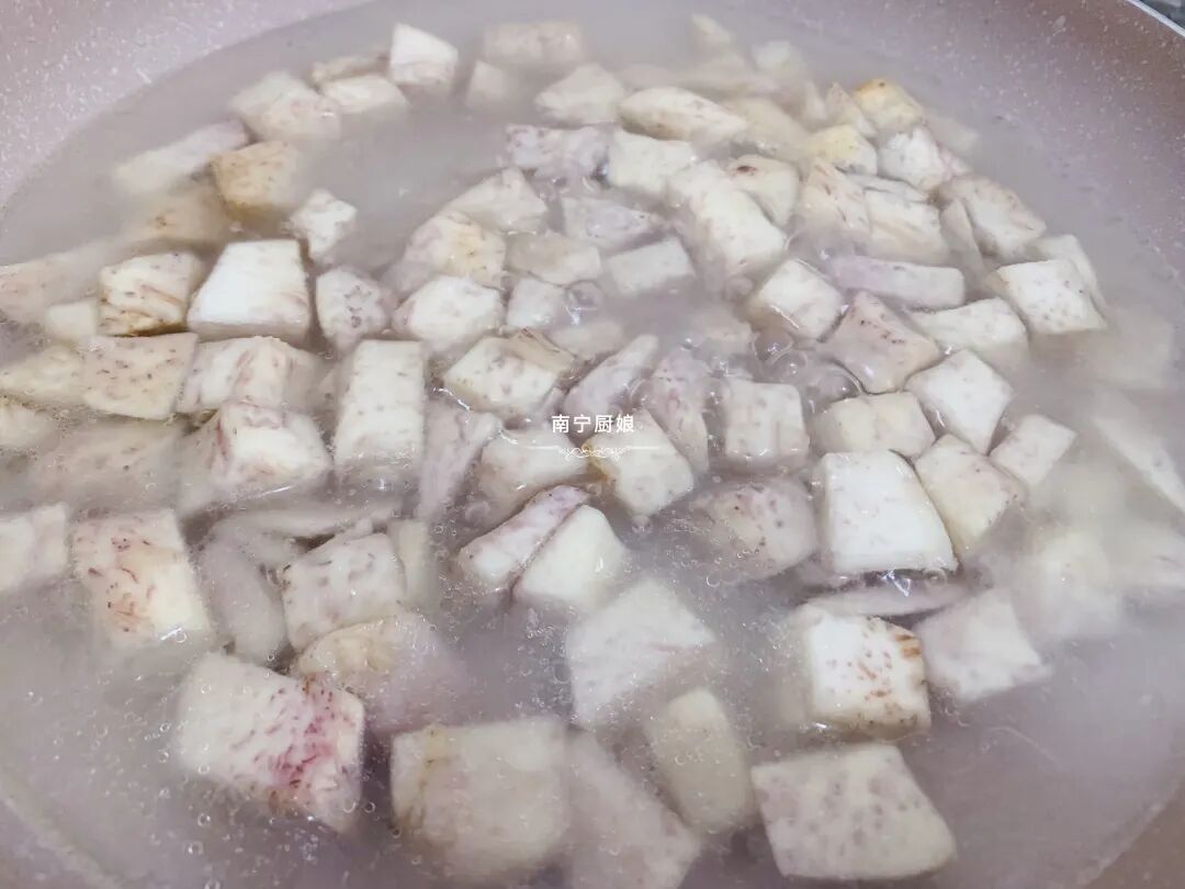 4、倒入没过芋头块的热水,开大火烧沸,然后可以用锅铲把芋头块按压碎。