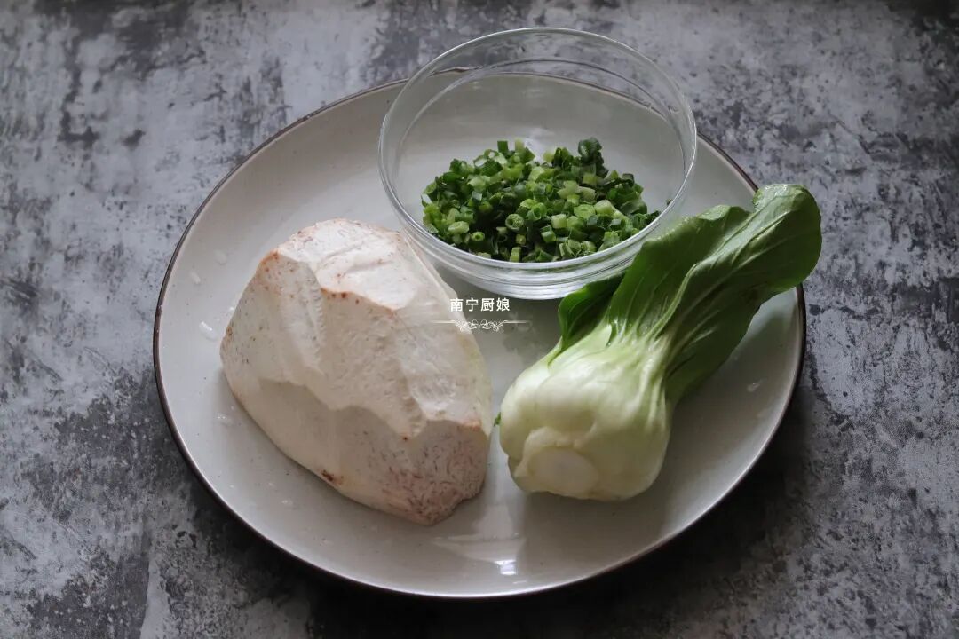 准备好食材:芋头半个、小白菜1颗、葱花1根、食盐1勺。