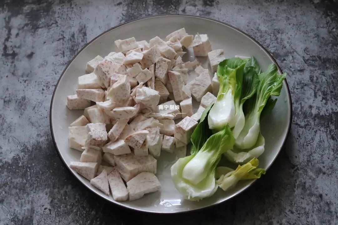 1、把芋头切成小块,小白菜掰开清洗干净。