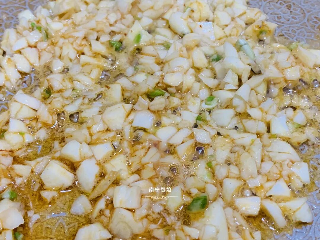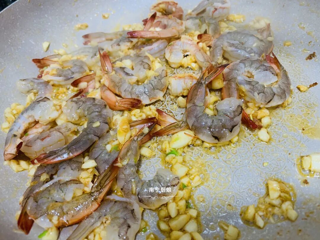 2、锅里的虾油继续小火烧热,把蒜米倒进去爆香。