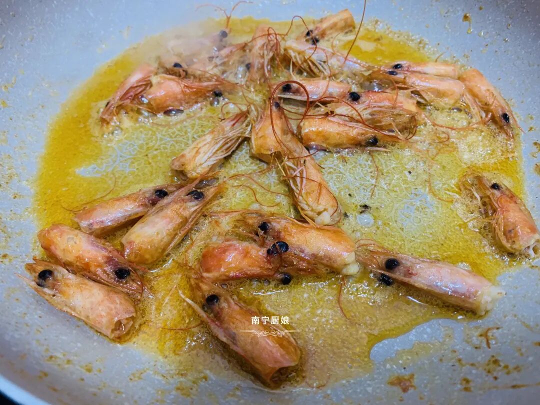 1、起锅,在锅里倒入适量的油,小火烧热,把虾头倒进去煸炒出虾油,然后把虾头丢掉。