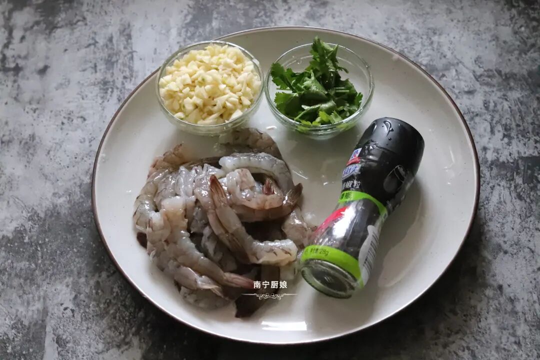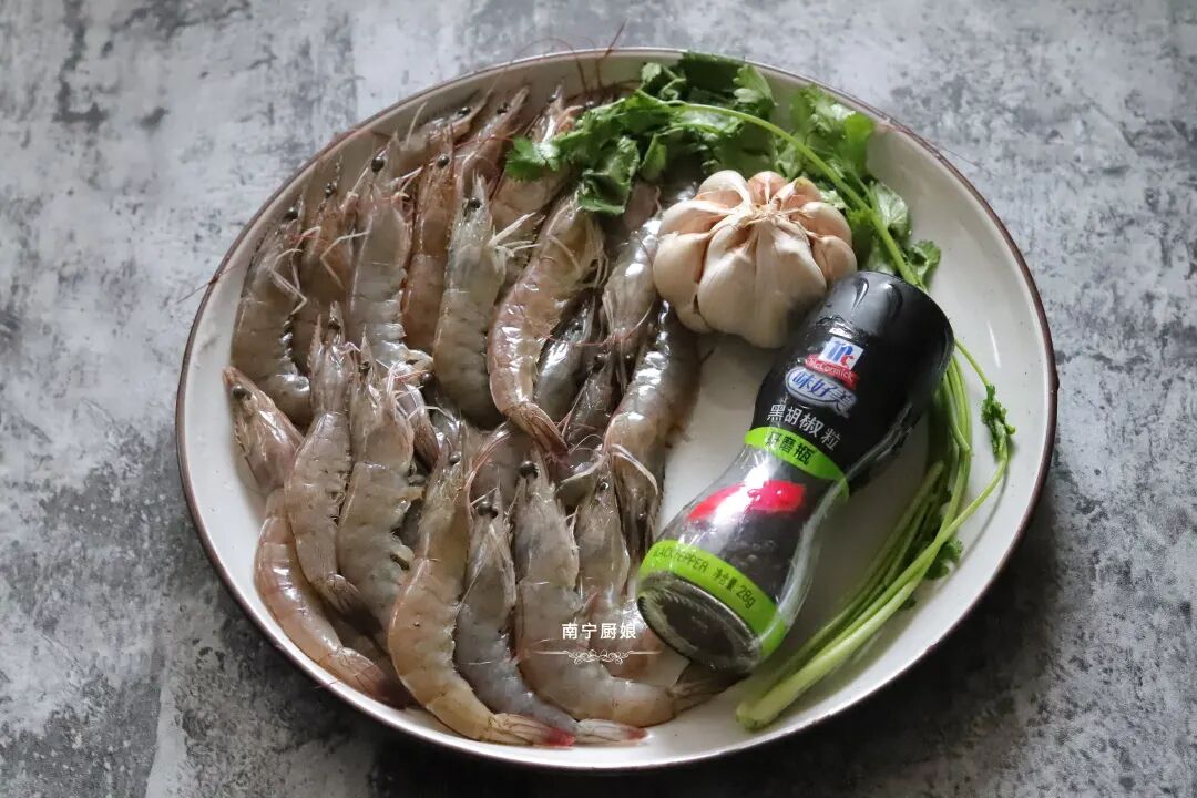 食材:虾500克、蒜米1颗、香菜1根、黑胡椒20克、白糖一小勺、生抽1勺、食盐1勺。