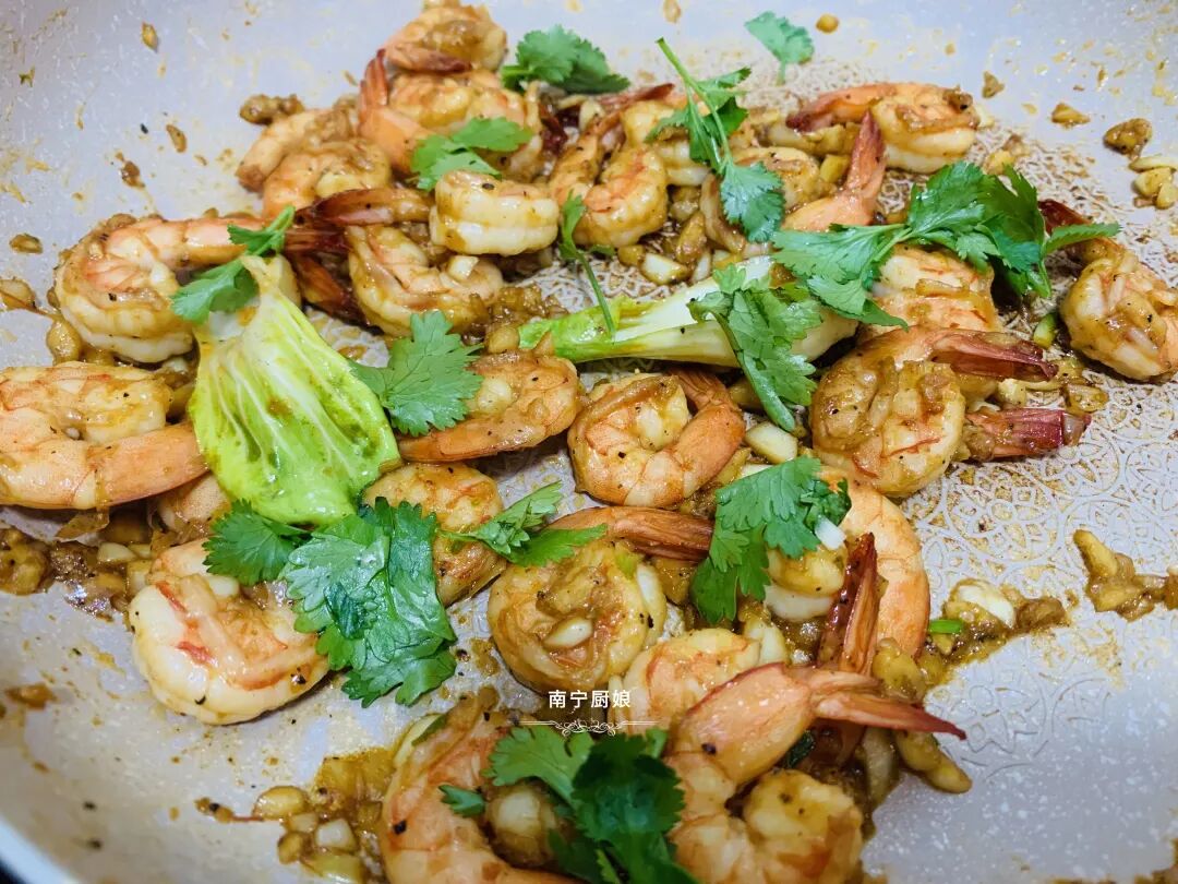出锅装盘,一盘色香味俱全的蒜香黑胡椒虾就做好啦!