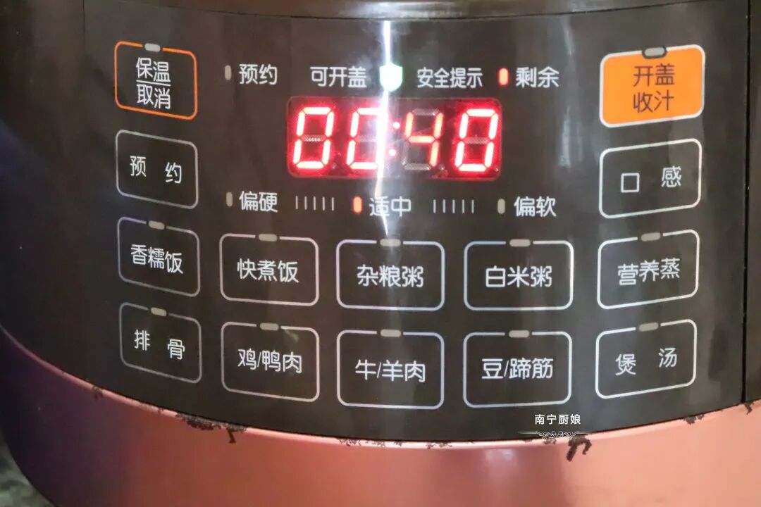 4、放入一小勺食盐作为前期调味,再放入一勺食醋的作用是能够让海带煮出来柔软可口,盖上锅盖,再选择煲汤键,等待40分钟即可自动煲煮好。