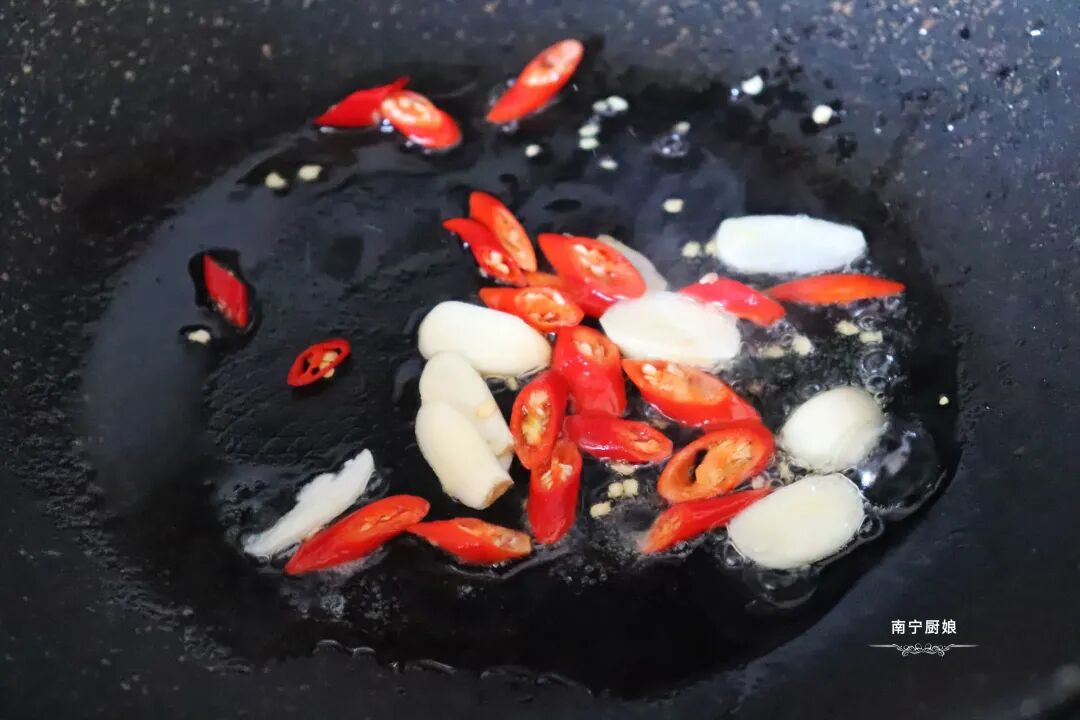 3、在锅里倒入适量油小火烧热,把大蒜和小红椒倒入爆香。