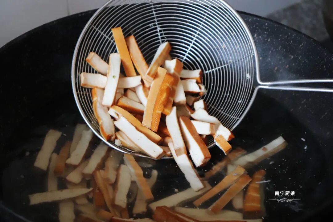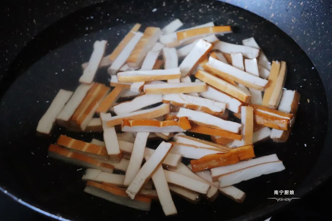 2、在锅里烧热半锅水,然后把豆腐干条倒入焯水1分钟后捞出沥干水分装盘待用。