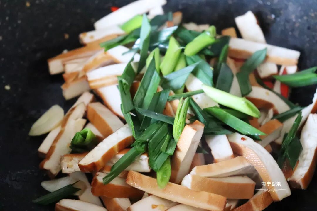 4、接着把豆腐干倒入锅中翻炒1分钟,再把青蒜段倒入一起炒香。