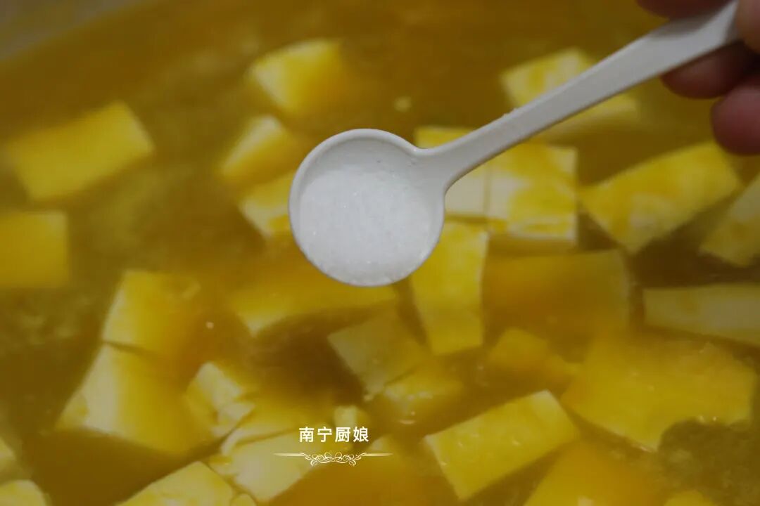 5、把豆腐块倒入锅中和南瓜汤一起继续烧煮至南瓜汤浓稠。