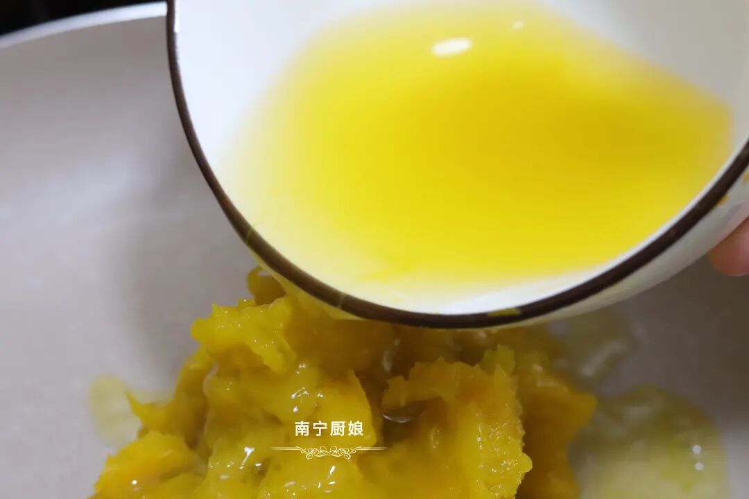 3、南瓜蒸软后,出锅用一个汤勺按压成南瓜泥。