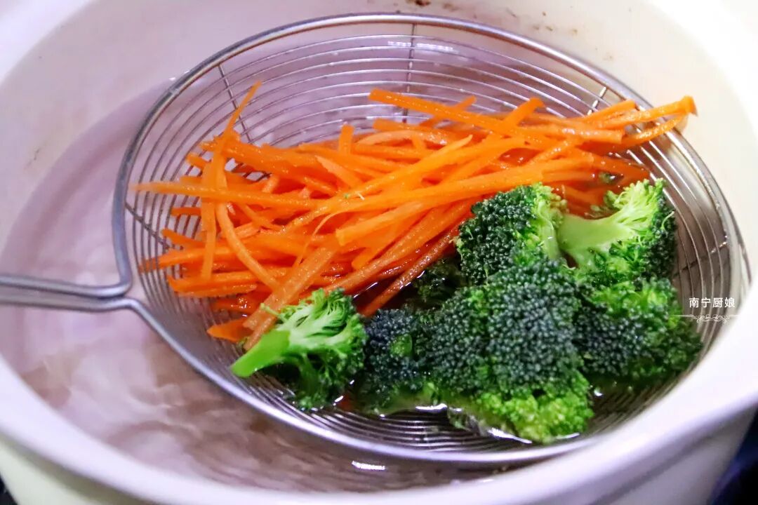 1、在锅中烧热半锅水,水烧开后滴入几滴油,再倒入西兰花、胡萝卜丝(提前把胡萝卜切丝),焯水2分钟捞出沥干水分。(西兰花焯水后会更翠绿哦,如果不喜欢焯水也没关系)